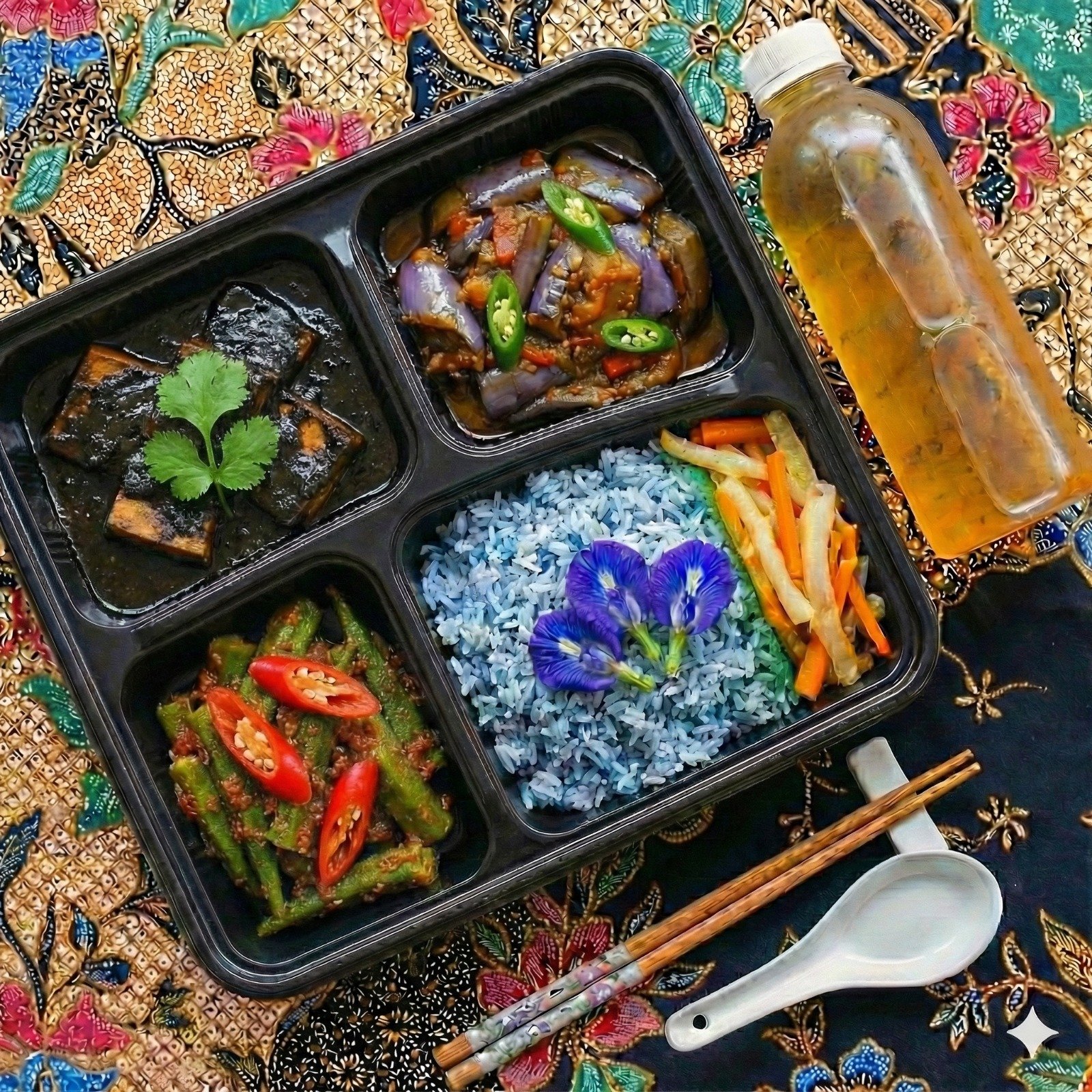 Vegetarian Value Bento includes Tofu Buah Keluak, Assam Brinjal, Sambal Lady’s Finger, Achar, Blue Butterfly Pea Rice and a FREE bottle of home-brewed Chrysanthemum Tea (500ml).